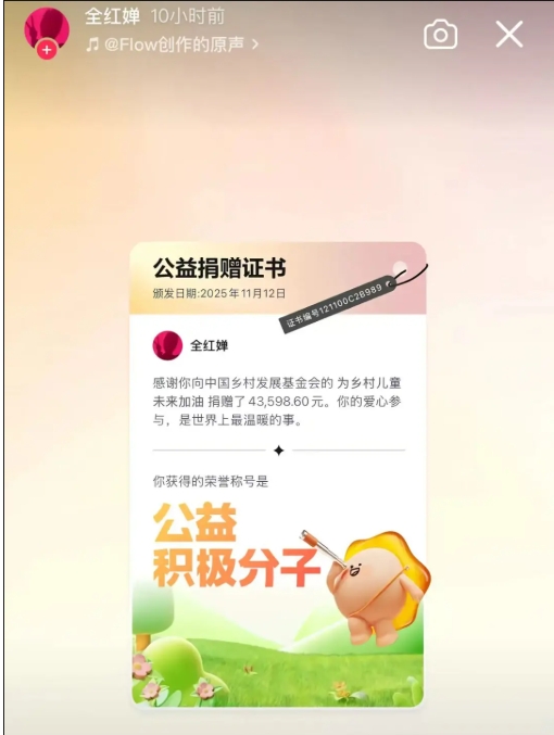 생방송이 끝난 후 전홍선은 방송 수익금 4만 3598.6원을 전부 기부했다.