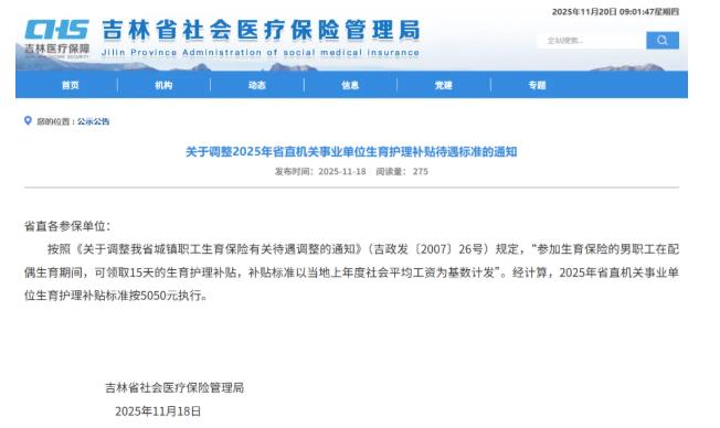<길림성 도시진 종업원 출산보험대우를 조정할 데 관한 통지>(길정발[2007]26호) 규정에 따라 “출산보험에 가입한 남성종업원은 배우자의 출산기간 동안 15일간의 출산간호보조금을 받을 수 있으며 보조금기준은 전년도 현지 사회 평균로임을 기준으로 한다.” 계산을 거쳐 2025년 성직속 기관 및 사업단위 출산간호보조금기준은 5050원에 따라 집행한다.