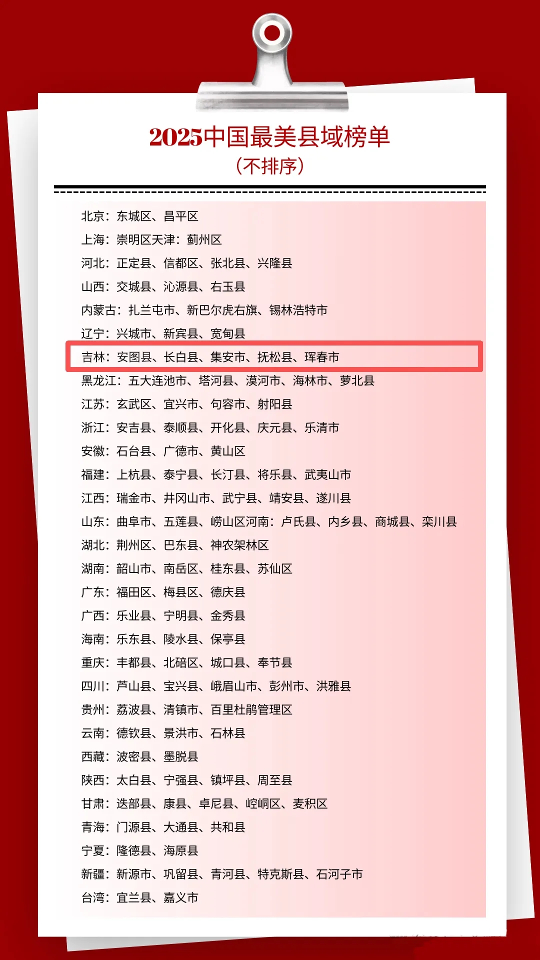 최근 2025 중국 가장 아름다운 현구역 순위가 발표되였는데 길림성에서 안도현, 장백현, 집안시, 무송현, 훈춘시 등 5개 지역이 입선되였다.